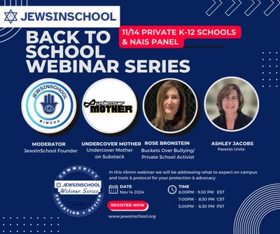 For Students, Parents & Teachers in private and independent schools. Founders of Undercover Mother, Buckets Over Bullying and Parents Unite will address issues of antisemitism and share their insights on policies and practices and give recommendations.